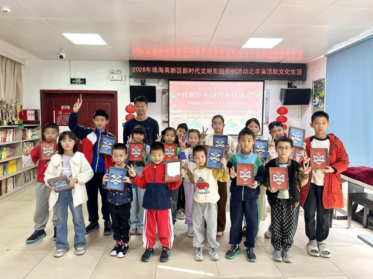 万象更新日,祥狮迎瑞来。当传统醒狮文化邂逅元旦和亲子,会激荡出怎样的创意火花?2026年1月1日,珠海唐家湾镇后环社区新时代文明实践站举办“我们的节日•元旦”“祥狮跃元旦•巧手裱福运”国潮醒狮装饰画亲子手工技能培训活动。辖区20组亲子家庭齐聚一堂,在文化的熏陶与手工的乐趣中,共同开启了一个充满传统韵味与喜庆色彩的新年。