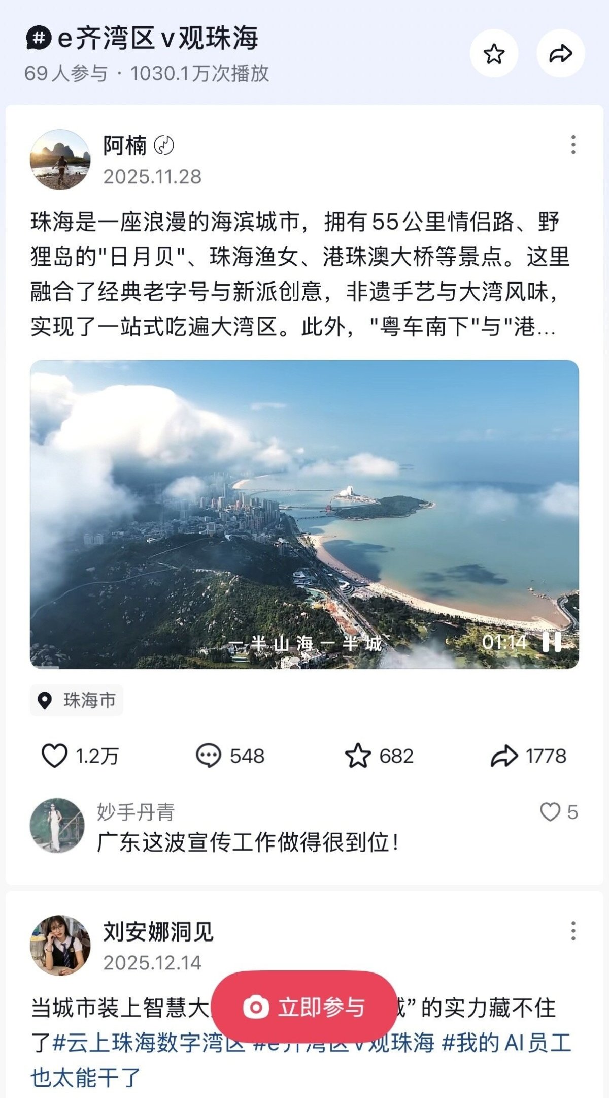 聚焦新质生产力,网络大V探访金山WPS、南方海洋实验室等点位,深挖“云上智城”“低空经济”发展成果,解读AI赋能实践,用接地气的镜头语言直观呈现珠海技术实力与投资潜力。聚焦农文旅融合,网络大V打卡大赤坎村、东澳岛、唐家古镇等点位,体验现代渔场高效协同,感受乡土文韵、山海浪漫,“半城山水半城湾”的生态美景让网友直呼“谁能拒绝这样的浪漫”。活动构建“深度创作+矩阵传播”的纵横立体传播架构,网络大V在抖音、小红书、微信视频号等平台同步发力,形成传播热潮。联动外籍及港澳达人通过Instagram等海外主流平台发布作品,对外展现中国高质量发展成效与珠海城市魅力。