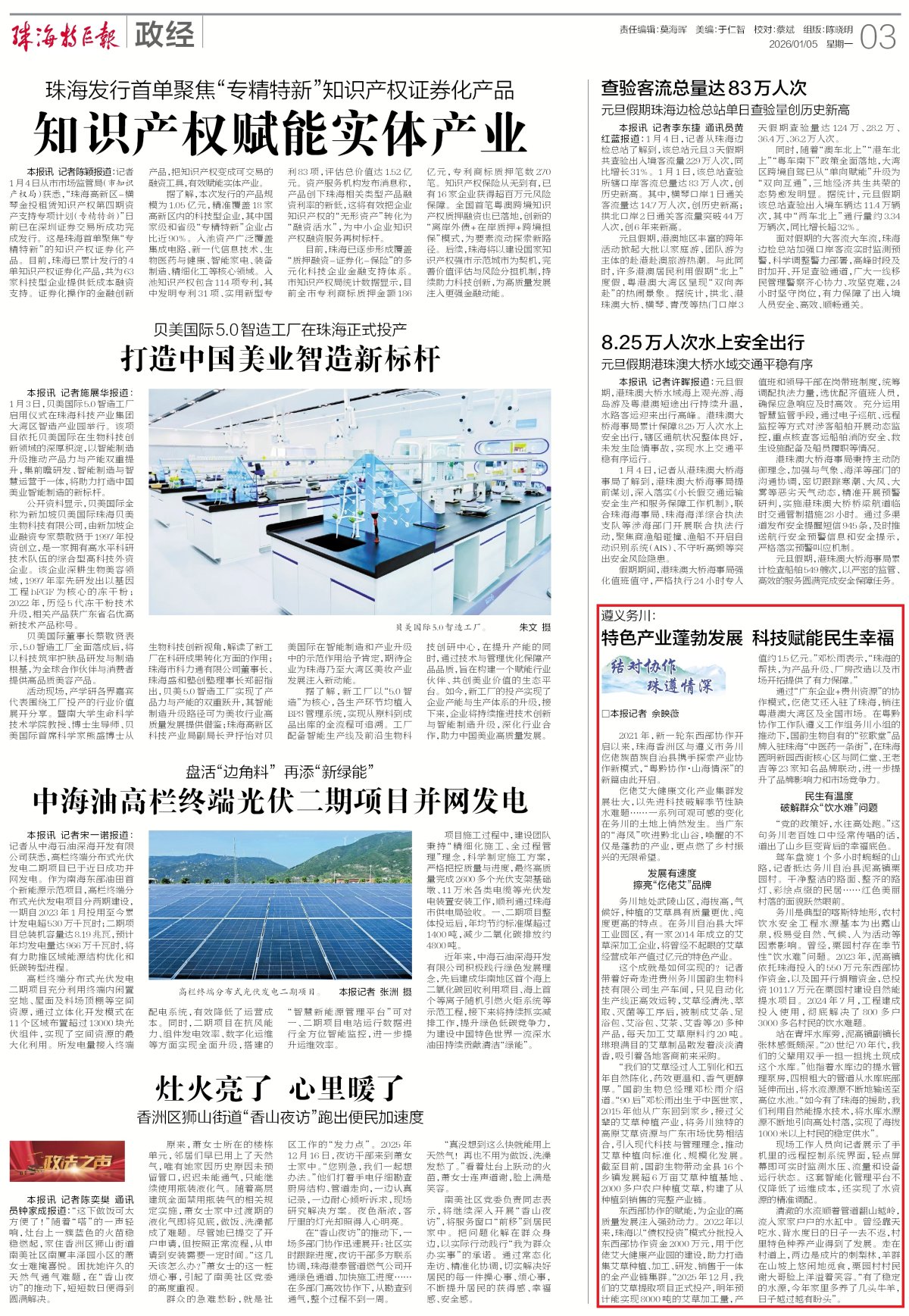东西部协作的赋能,为企业的高质量发展注入强劲动力。2022年以来,珠海以“债权投资”模式分批投入东西部协作资金2000万元,用于仡佬艾大健康产业园的建设,助力打造集艾草种植、加工、研发、销售于一体的全产业链集群。“2025年12月,我们的艾草提取项目正式投产,明年预计能实现8000吨的艾草加工量,产值约1.5亿元。”邓松雨表示,“珠海的帮扶,为产品升级、厂房改造以及市场开拓提供了有力保障。”