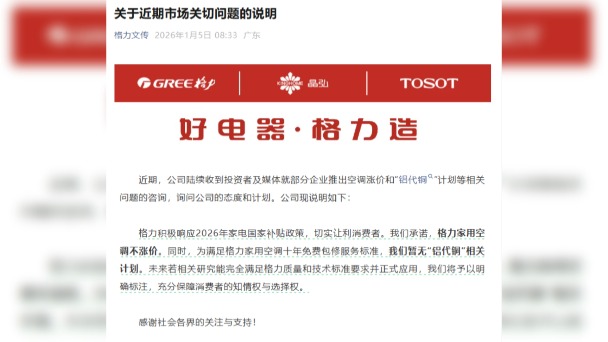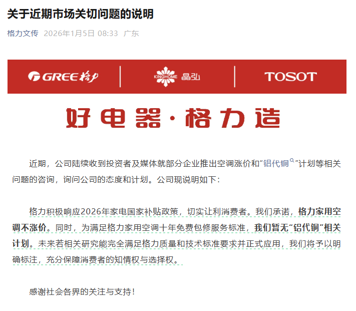 格力电器在公告中表示,格力积极响应2026年家电国家补贴政策,切实让利消费者,并承诺“格力家用空调不涨价”。为满足格力家用空调十年免费包修服务标准,格力电器暂无“铝代铜”相关计划。未来若相关研究能完全满足格力质量和技术标准要求并正式应用,将予以明确标注,充分保障消费者的知情权与选择权。