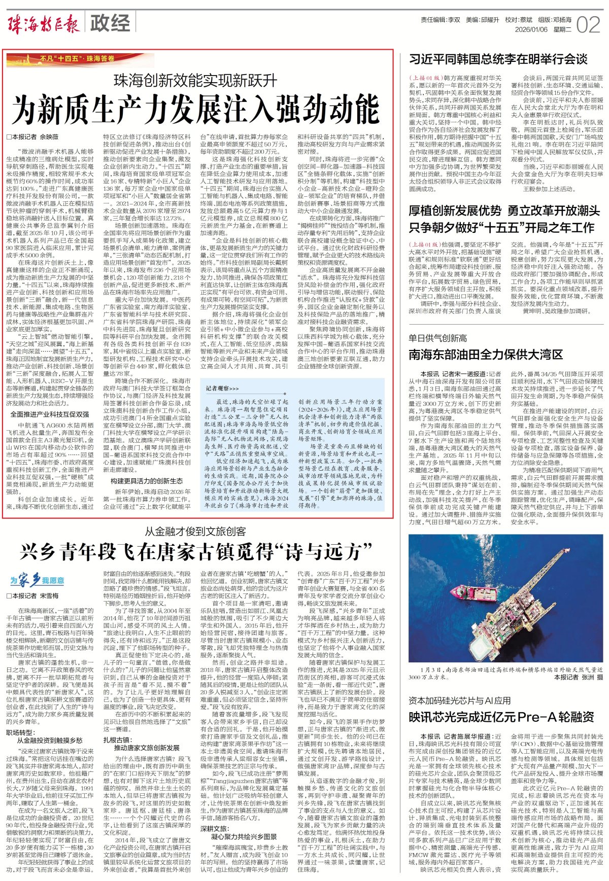 “云上智城”燃动智能引擎,“天空之城”迎风展翼,“海上新基建”走向深蓝……展望“十五五”,珠海正因地制宜发展新质生产力,推动产业创新、科技创新、场景创新“三新”深度融合,拓展人工智能、人形机器人、RISC-V开源生态等新赛道,构建起贯穿全链条的新质生产力发展生态,持续增强经济发展动力和社会活力。