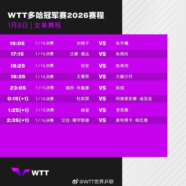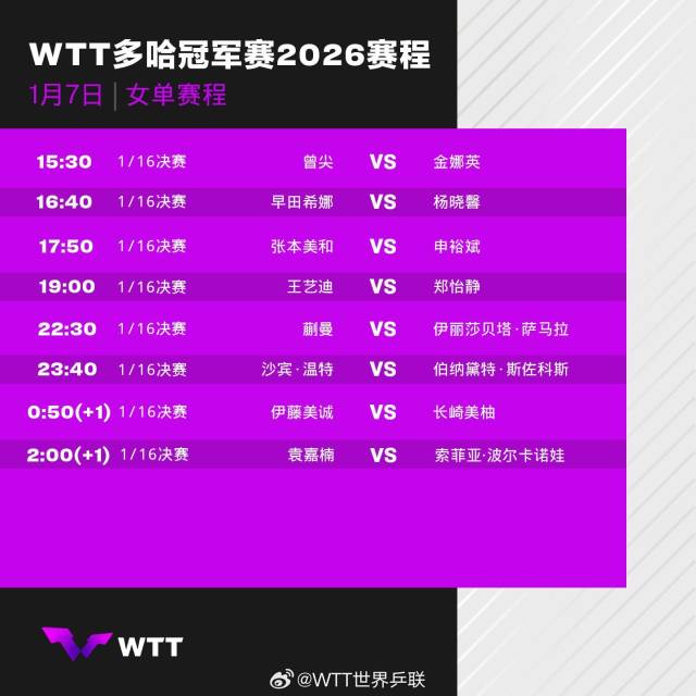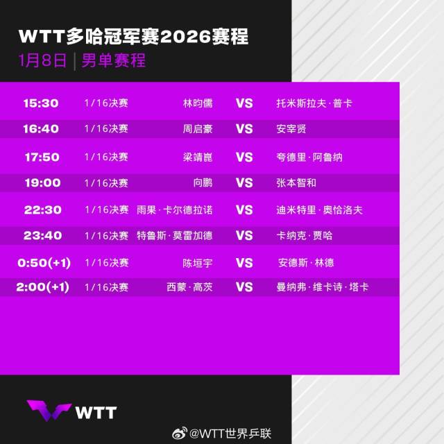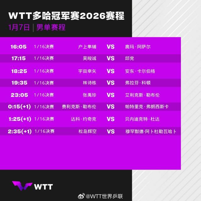 2026年WTT多哈冠军赛将于1月7日至11日在卡塔尔多哈卢赛尔体育馆举行,男女单打各32名选手展开争夺,首轮比赛对阵赛程请查收↓