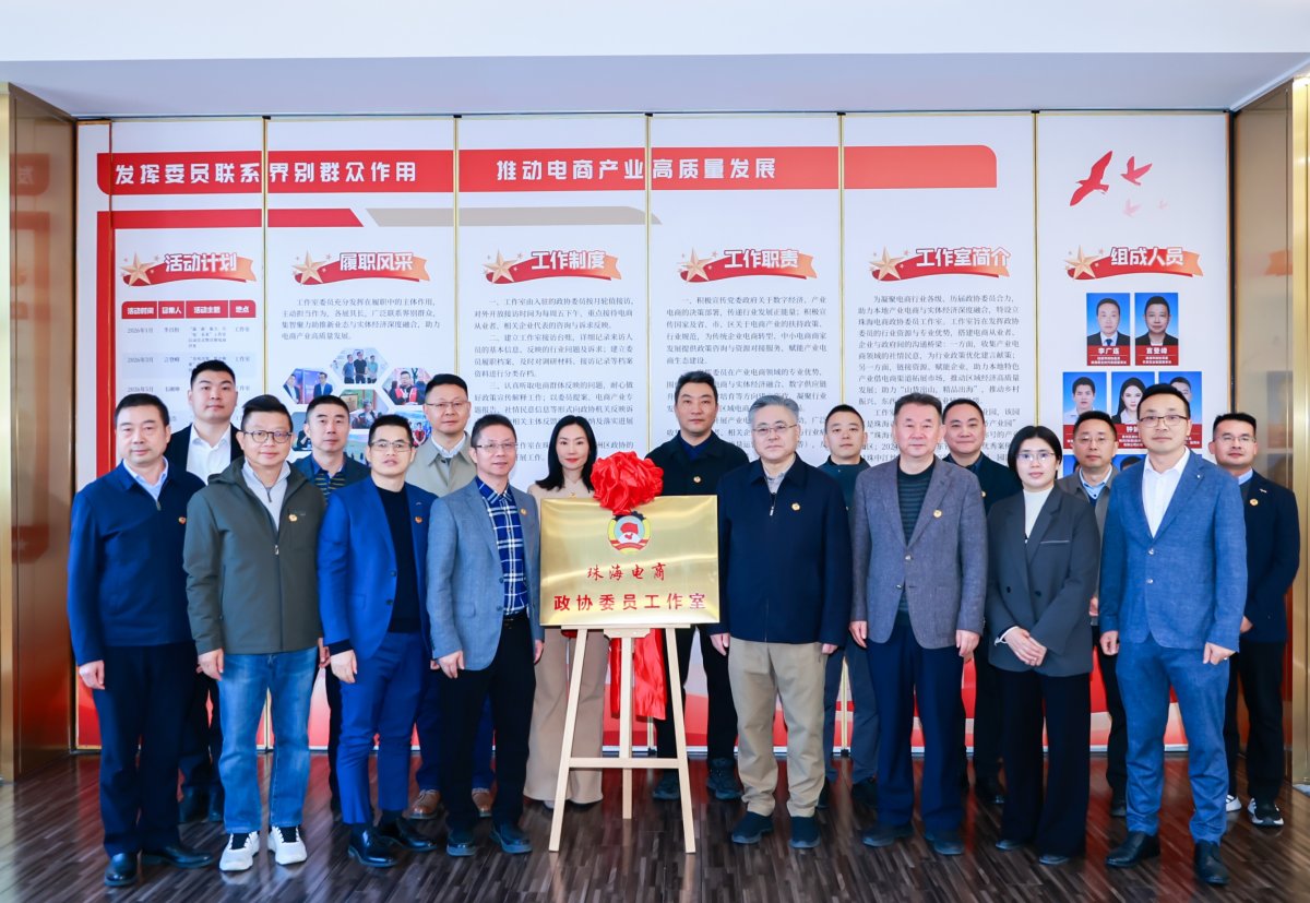 1月6日,珠海电商政协委员工作室在珠海再生时代电商产业园正式揭牌成立。该工作室由8位市、区两级本届及往届政协委员联合组建,打破传统履职的地域与层级限制,为政协委员联动服务电商产业发展搭建了专业化新平台。
