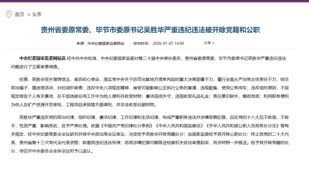 经中共中央批准,中央纪委国家监委对第二十届中央候补委员,贵州省委原常委、毕节市委原书记吴胜华严重违纪违法问题进行了立案审查调查。