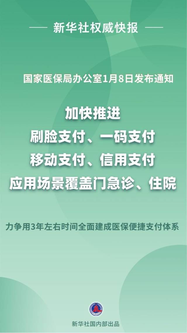 聚焦群众看病缴费“多次排队”“排长队”等堵点痛点,国家医保局办公室1月8日发布《关于大力推进刷脸支付、一码支付、移动支付、信用支付等便捷支付工作的通知》,明确加快推进刷脸支付、一码支付、移动支付、信用支付在各类医疗场景落地,力争用3年左右时间全面建成医保便捷支付体系。