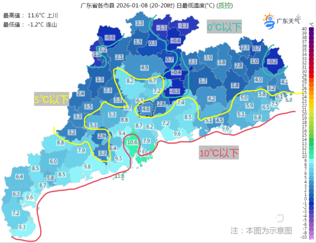 今天(1月8日)开始进入“三九”,位于岭南的广东也迎来了一个寒冷的早晨,在冷空气和晴空辐射效应影响下,早晨粤北大部、肇庆大部、云浮大部、惠州北部市县最低气温为零下1~4℃,其中高海拔山区零下6~零下1℃,有霜冻或冰冻,其余大部市县都在10℃以下(5~9℃)。今晨清远连山录得全省最低气温零下1.2℃。而广州国家站录得最低气温4.6℃,是广州去年入秋以来的最低气温。