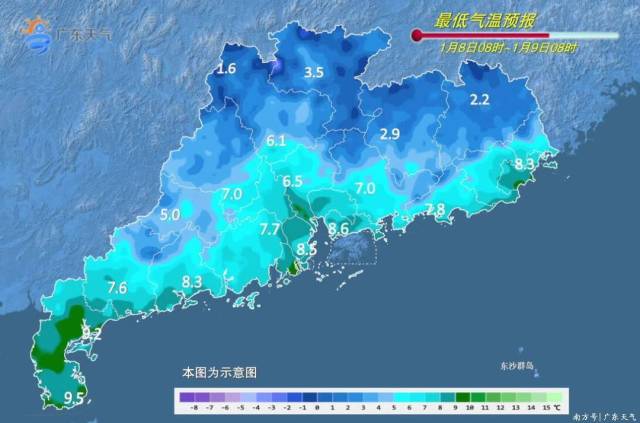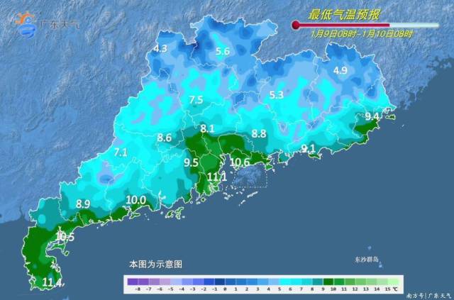 进入“三九”了,广东未来几天还会更冷吗?今明两天(8-9日),影响广东的冷空气(地面冷高压)逐渐减弱,白天阳光和暖,最高气温有所回升,但早晨晴空辐射效应明显,早晚寒冷,粤北和珠三角北部有大范围5℃以下低温,部分市县有霜冻或冰冻,昼夜温差大。10日白天云量增加,气温回升,夜间起新一股冷空气补充影响广东,但由于引导冷空气南下的高空槽纬度偏北,这股冷空气的影响不会特别强,11日白天广东省各地的最高气温有小幅下降,早晚依然较寒冷。