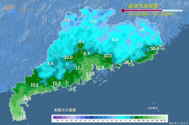 展望12日,随着冷空气逐渐东移出海,广东东南部沿海地区受高压后部偏南气流影响,云量增多,局部有零星小雨,但早晚仍较寒冷,而北部的冷空气“余威”仍在,粤北偏北市县有5℃以下低温。总的来说,未来几天“阿冷”影响仍活跃,气温波动,但早晚寒冷、昼夜温差大的“主调”还是没变的,高海拔山区有霜冻或冰冻,防寒保暖仍不能松懈。具体天气预报9日,广东省大部晴间多云。最低气温:粤北、珠三角北部市县0~5℃,其中高海拔山区-3~0℃,部分市县有霜冻或冰冻,雷州半岛南部市县10~12℃,其余市县5~9℃。
