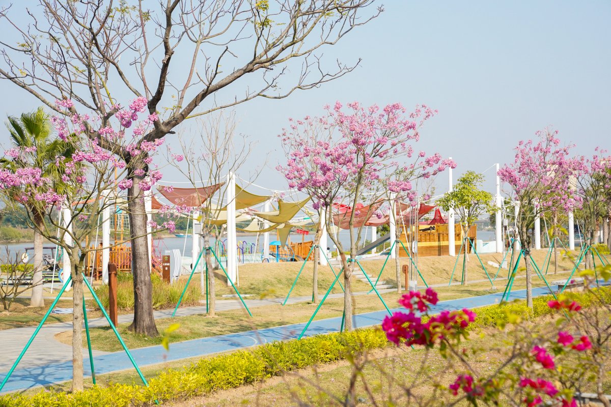 在南水公园内,长约两公里的休闲步道两旁,粉紫、淡紫的紫花风铃木层层叠叠,随风摇曳。阳光下花瓣泛着温柔光泽,步道平整洁净,花香沁人心脾。无论是晨练的居民、嬉戏的孩童,还是结伴而行的老友,都能在这条“花漾步道”上,感受自然与生活的美好交融。长长的休闲路径不仅是通行之道,更成为市民家门口的“幸福走廊”。