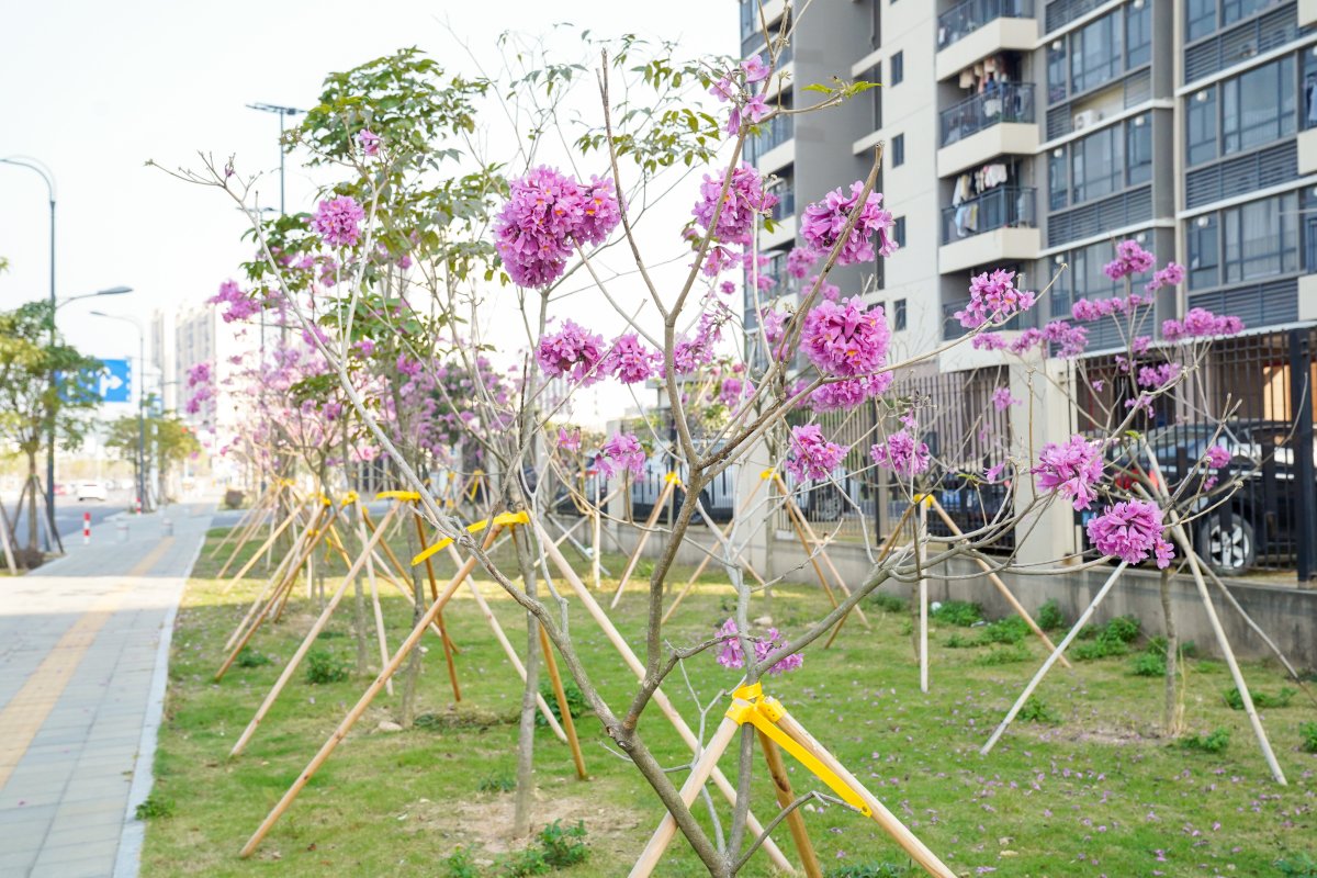 距此不远,汇华水岸小区旁800米长的花带同样引人注目。整齐排列的紫花风铃木与零星点缀的黄花相映成趣,形成一条高颜值景观带,实现了居民“推窗见绿、出门赏景”的宜居环境。