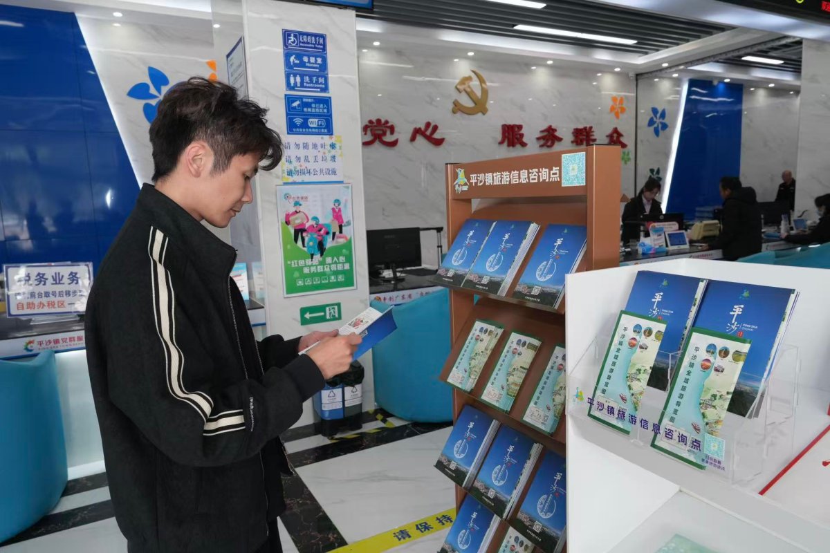在平沙镇旅游信息咨询点,居民和游客可免费领取旅游手册、全域旅游导览图、平沙美食地图,这些都将成为游客在平沙触手可及的“旅游搭子”,让大家随心畅游甜蜜平沙。