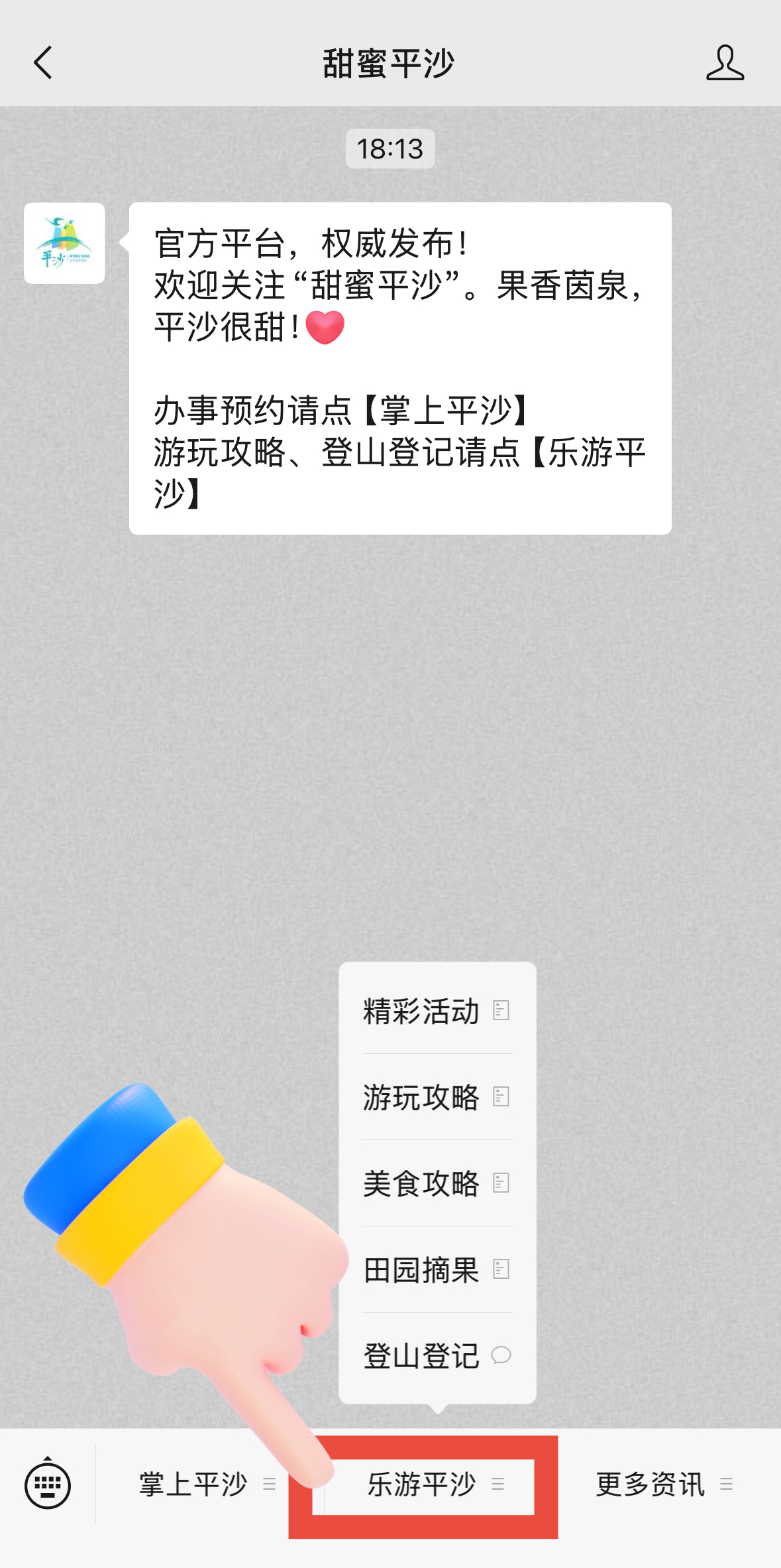 此外,群众还可以关注“甜蜜平沙”公众号,获取平沙镇最新的政务服务、民生资讯、游玩攻略,点击菜单栏中的「乐游平沙」,还可查看精彩活动、游玩攻略、美食攻略、田园摘果等最新、详细的资讯。