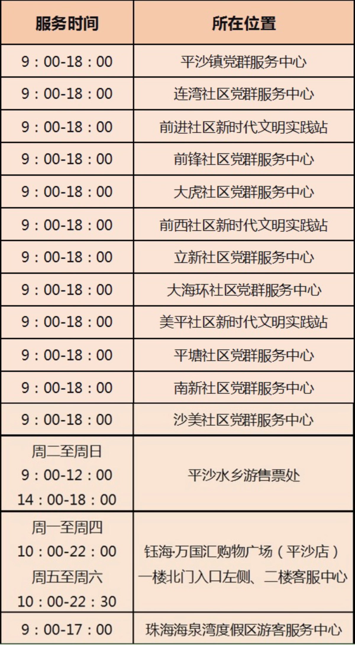 “平沙镇旅游信息咨询点”的点位按照“一个核心、十二个站点、N处延伸”进行打造,构建起“1+12+N”平沙镇全域旅游信息服务网络,力争“处处有服务、时时可咨询”。其中,平沙镇党群服务中心为1个核心咨询点,还包括了全镇12个社区党群服务中心或新时代文明实践站,延伸至钰海·万国汇购物广场(平沙店)、平沙水乡游、珠海海泉湾度假区、绿手指有机农园、夏场长特色水果采摘园等热门景区、商圈。