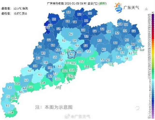 1月9日8点,广东连山冷到零下0.6℃,珠海最暖才12.5℃,大鸡腿冻成冰鸡腿!上班路上的你,觉得冻手冻脚不?不要着急,相较这两天的低温冰冻,这周末的气温将会有所回升。