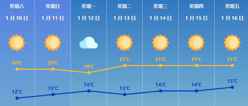 据珠海市气象台消息,预计10-11日我市天晴干燥,昼夜温差大,气温逐渐回升;12日云量增多,展望13-16日再转晴好天气。温馨提示:天气持续干燥,请注意防火和用火用电安全。