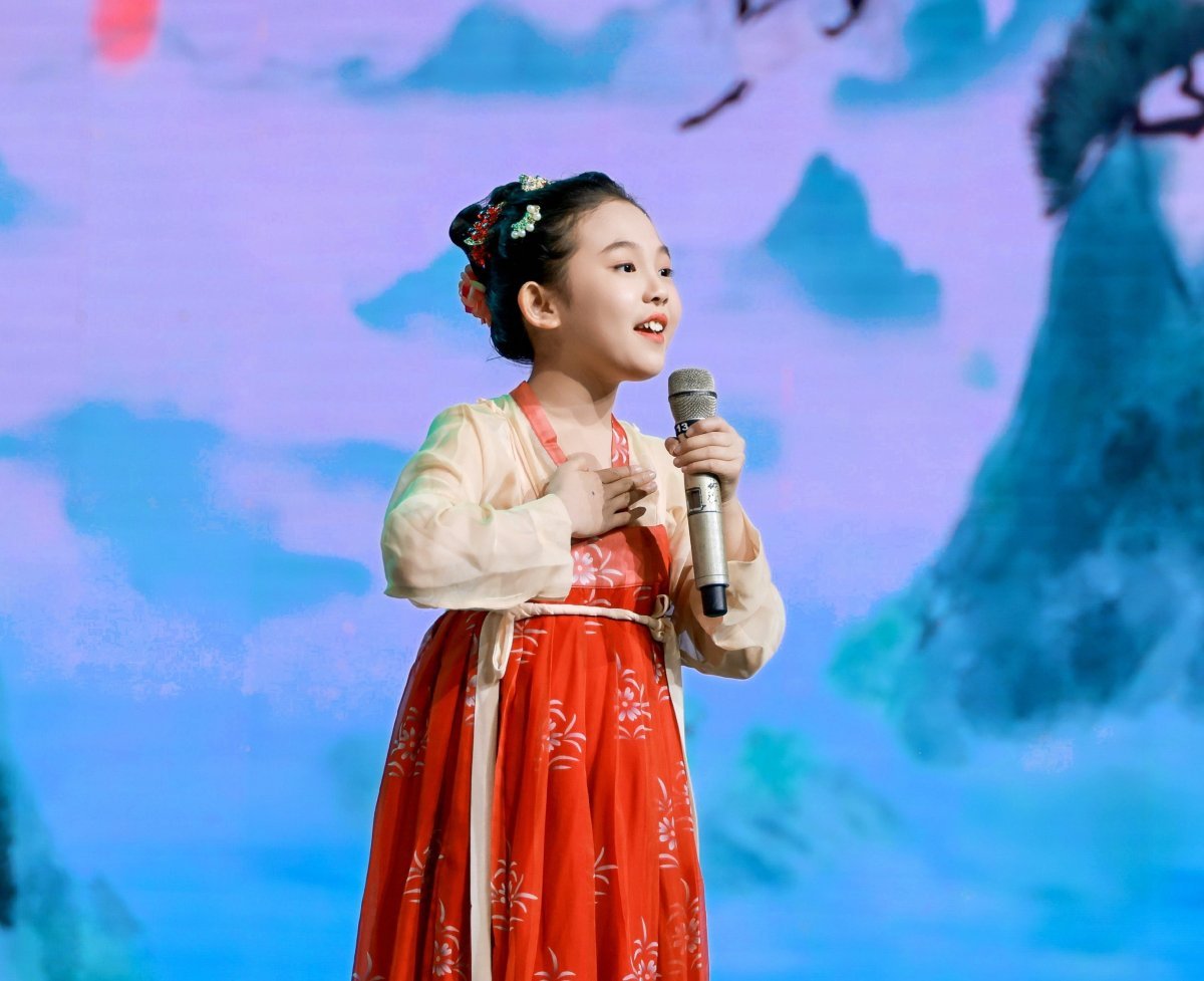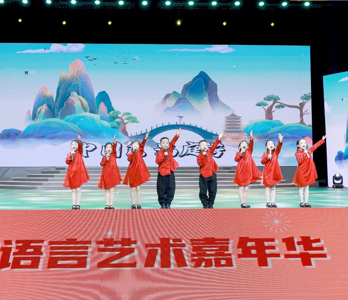 第二章《童声逐梦岁华新》洋溢着纯真童趣与少年朝气。深情的朗诵《奇妙的世界》、活泼的儿童剧《小老鼠吃辣椒》等节目,生动描绘了孩子们童年的多彩画卷,展现了他们丰富的想象力和舞台表现力。