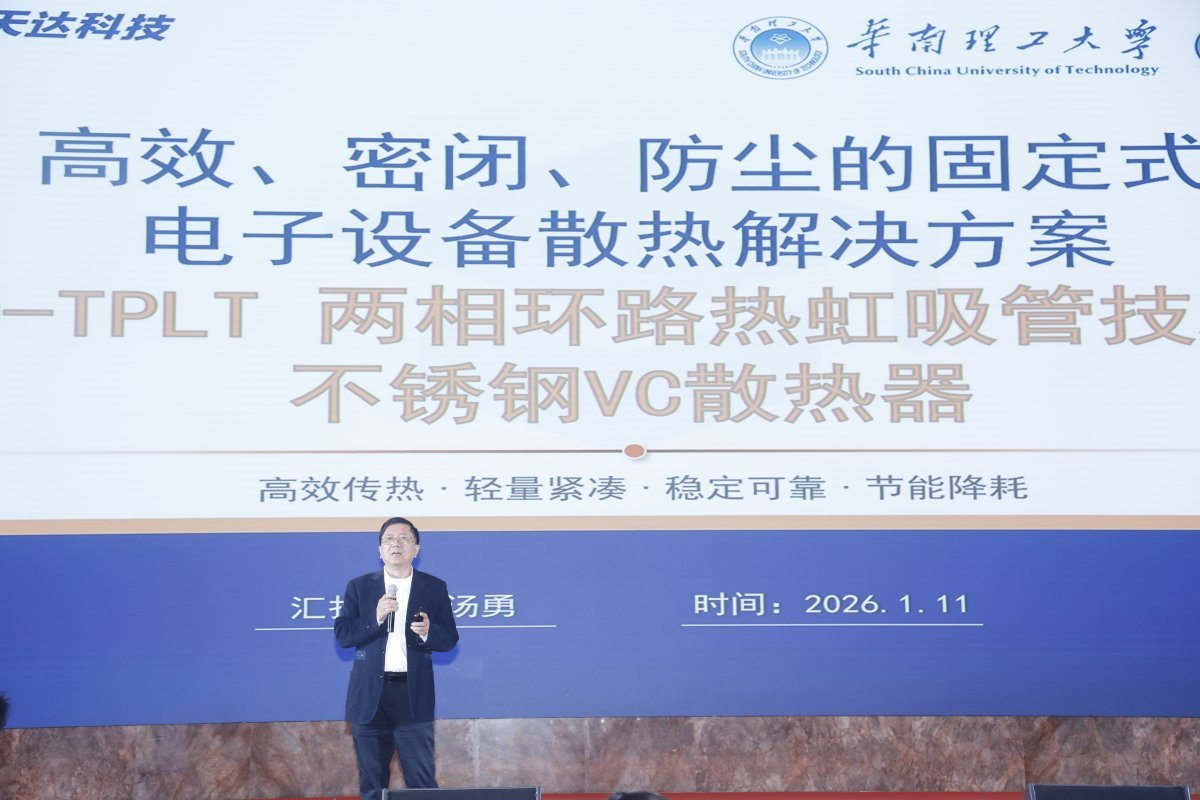 发布会现场,天达热管理首席科学家、国务院政府特殊津贴专家汤勇受邀发布新品。据悉,此次推出的两款核心新品由天达联合华南理工大学攻关、携手大连理工大学深化研发,已完成技术落地与场景适配,可广泛应用于算力、新能源等前沿领域。