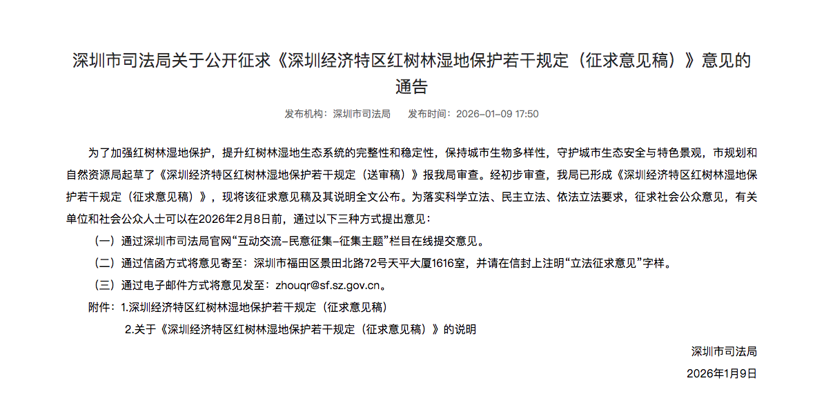 据了解,此次征求社会公众意见将于2月8日截止。有关单位和社会公众人士可通过深圳市司法局官网“互动交流-民意征集-征集主题”栏目在线提交意见,或通过电子邮件方式将意见发至zhouqr@sf.sz.gov.cn。