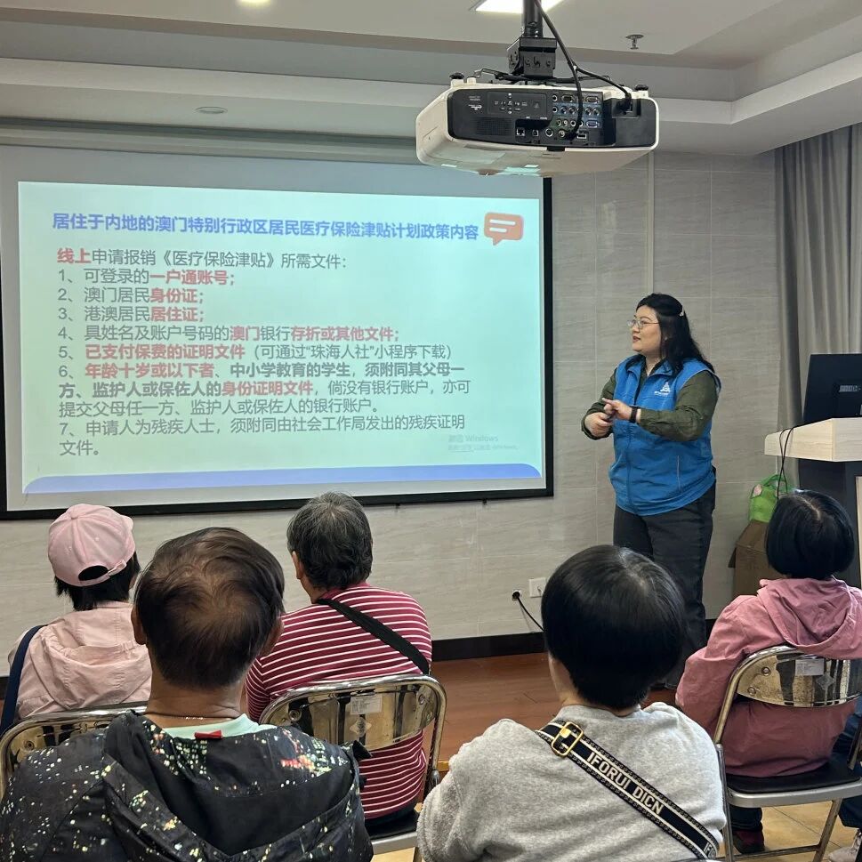 活动开始,工作人员首先阐述了澳门特别行政区政府推出居民参与内地医保津贴政策的重要意义,指出该政策不仅有助于澳门居民纳入内地医疗保障体系,更是支持他们融入国家发展大局的重要举措。为使澳门居民更清晰、全面地理解政策内容,工作人员系统性地从政策要点、医保分类、申请条件及办理流程等方面进行了详细解读与分享。