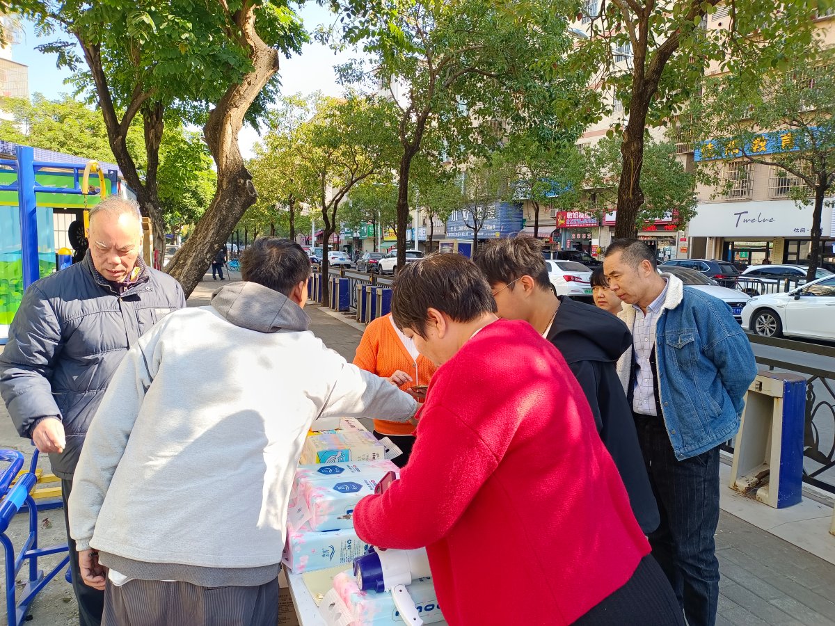 在南屏十二村康园中心的门口,也是大路旁义卖活动现场,康园中心的会员们从最初的腼腆羞涩,逐渐变得主动热情,认真为街坊介绍货品优势。优质实惠的货品叠加会员们的真诚招徕,吸引了不少路人驻足购买。前来“帮衬”的街坊李阿姨说:“买纸巾还能支持康园中心会员们的就业实践,很有意义。”
