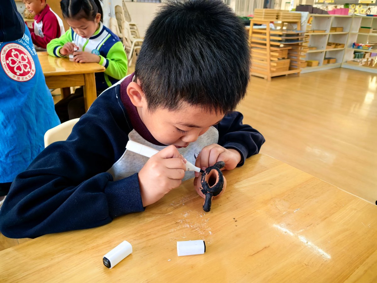 在华丰幼儿园,孩子们共同聆听大虎水井口遗址背后的故事,并以大虎水井口出土的文物为模型进行文物复刻体验,在学习和实践中深入了解大虎水井口遗址。