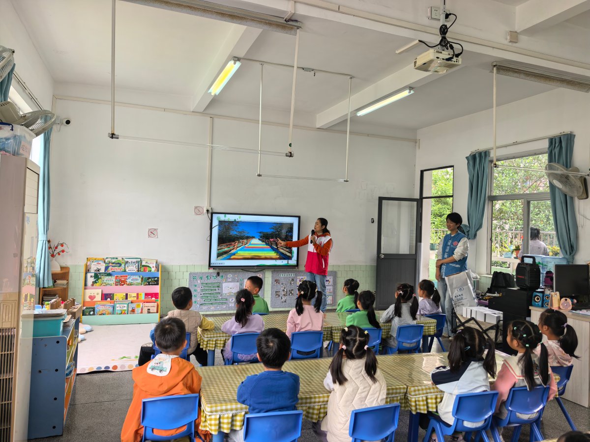 在大地幼儿园,通过粤语讲述、实景认知和绘画创作,从孖髻山的传说、名字由来,到如今的彩虹步道,带领孩子们重新认识平沙地标景观“孖髻山”。