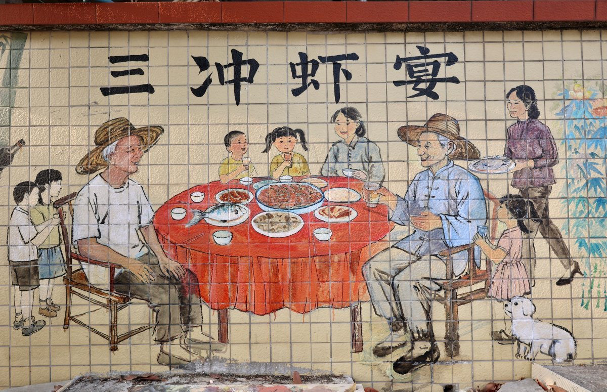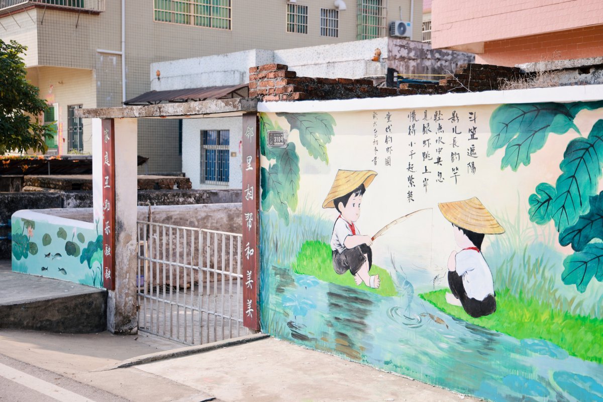 “草稿画出来,先拿给村干部和村民看,他们提意见,我们修改。”参与墙绘创作的珠海科技学院陈同学介绍,“有阿叔说,投喂虾苗的动作不是那样的,我们赶紧去现场重新观察、写生;有阿婆觉得虾的颜色可以更鲜活一点,我们马上调整。”