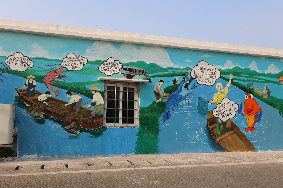移步换景,目光抬起,落在白墙黛瓦的民居墙面上,21幅流淌着生活气息与产业脉搏的墙绘呈现在眼前:生机勃勃的虾塘、老伯收虾、童戏钓虾、水田插秧、鱼虾初养、虾产业兴旺……