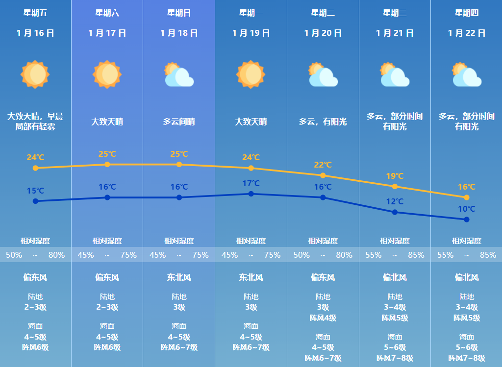 珠海方面,预计未来几天维持晴好天气,早晚清凉,午间温暖,昼夜温差较大;展望下周中期受冷空气影响,气温有所下降。