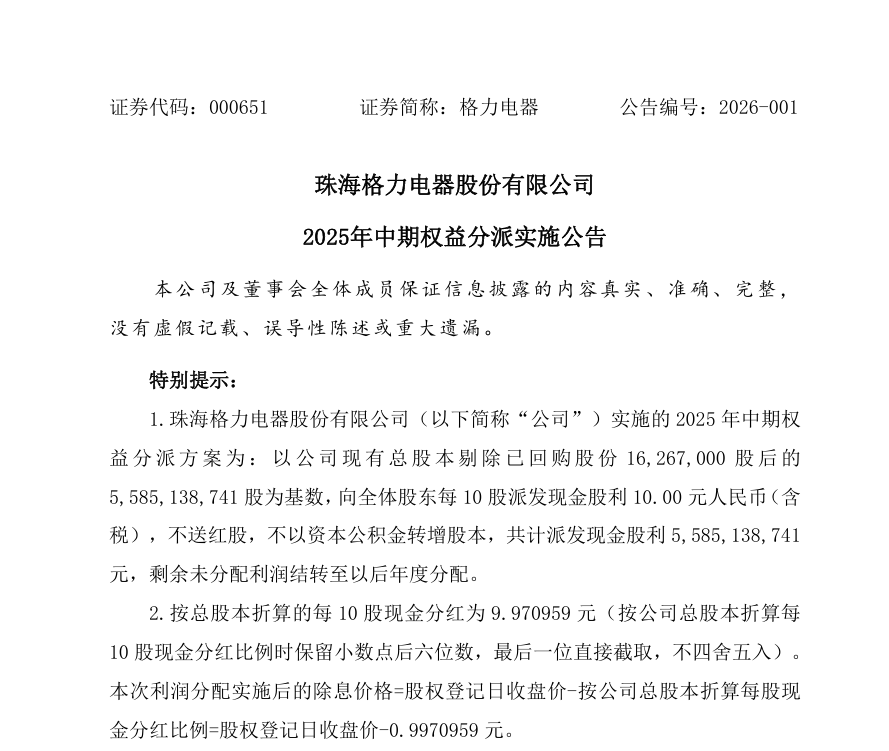 1月15日晚,格力电器披露2025年中期权益分派实施公告。