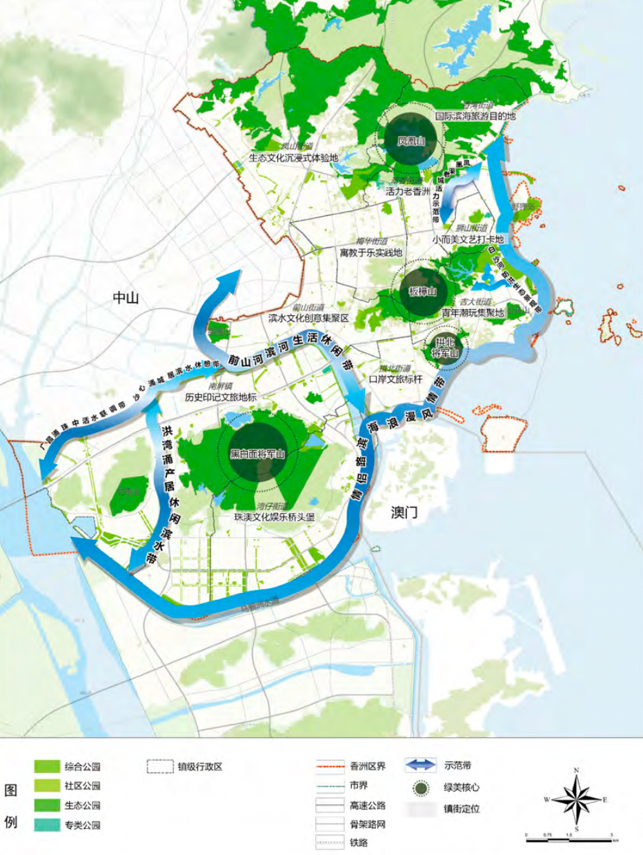 会上展示了《香洲区公园城市建设规划及行动方案(2025-2035)》建设成果,“一路、四核、六带、十片区”的空间布局同步亮相,成为香洲公园城市建设的核心框架。这一布局以自然禀赋为基底,将山海资源与城市功能深度融合,构建全域覆盖的绿色生态网络,助力中国式现代化城区样板建设。