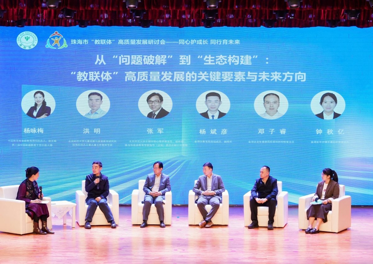在下午的“教联体”高质量发展研讨环节,多位国内知名专家进行分享。北京师范大学儿童发展与家庭教育研究员洪明解读了全国家校社协同育人“教联体”工作方案;中国教育报家庭教育周刊创办人、原主编杨咏梅系统梳理了全国协同育人的实践图谱;北京师范大学二级教授、心理学科建设负责人伍新春则聚焦珠海实际,探讨了“教联体”建设的关键突破。