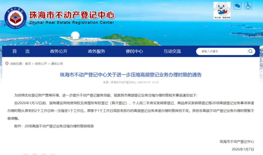 为深入贯彻落实国家、省、市关于优化营商环境、提升政务服务效能的决策部署,进一步优化我市登记财产营商环境,自2026年1月12日起,珠海市不动产登记中心进一步压缩不动产登记业务承诺办理时间,在全省率先将20项高频登记业务事项承诺办理时间由原来的2个工作日统一压缩至1个工作日,均已达到或优于全国最优办理时限。