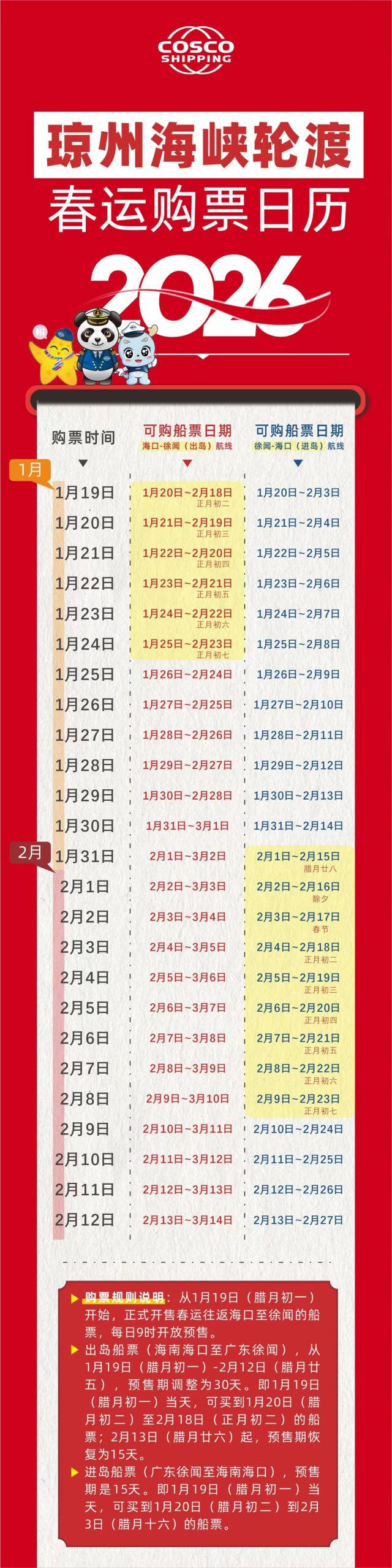 自驾海南过年的老广们请注意!2026年琼州海峡轮渡春运购票日历来了