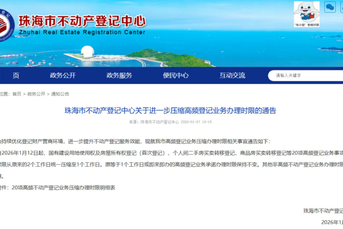 如今,“即来即办、智能秒批、1日办结”等带来的变化正发挥出持续优化珠海营商环境的作用,让申办人真切感受到珠海政务服务的务实高效。在不动产登记领域,近年来,珠海持续推动业务办理的提速增效。部分高频且风险可控登记业务已实现即来即办、1小时办结。线上办、指端办、全程网办全面普及。注销抵押、抵押权预告登记、按揭类抵押权首次登记等9类高频业务可“智能秒批”。市不动产登记中心统计数据显示,2025年全程网办业务量达11.54万宗,“智能秒批”业务量达5.65万宗;即来即办业务量达65351宗;在线开具证明56万余份,在线档案查询约7500人次,“以图查房”服务37.42万人次。