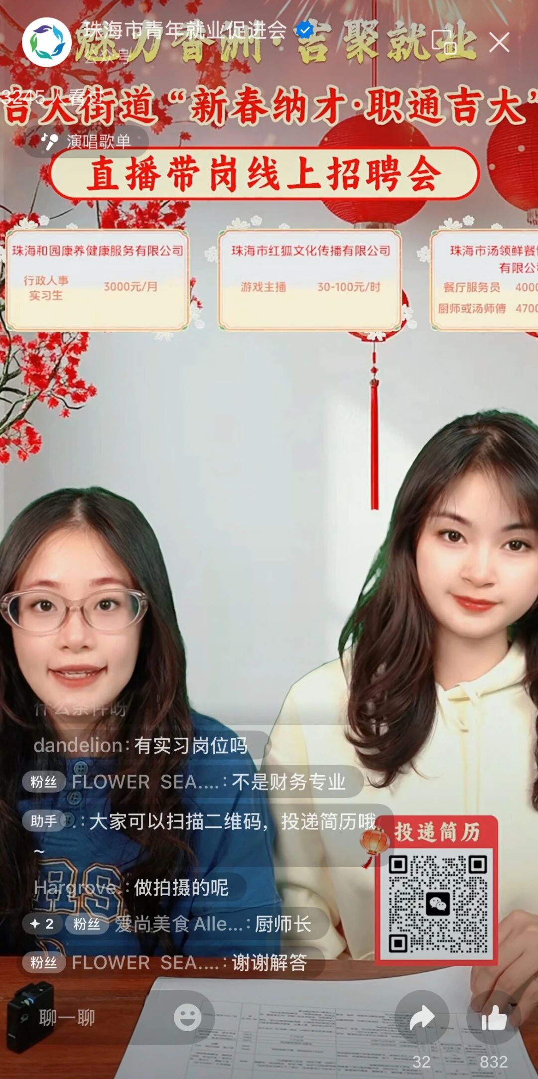 直播过程中,主播逐一详细解读岗位的职责要求、任职条件、薪酬福利及晋升通道,并实时回应评论区求职者的疑问,直播间互动氛围热烈,实现了“岗位推介—在线答疑—精准对接”的全流程服务。