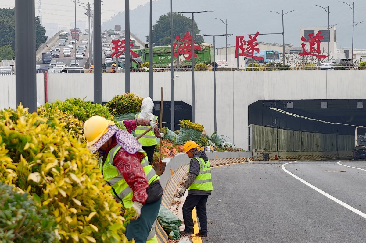 当天上午,记者在珠海隧道施工现场看到,新建的两条隧道均已完成沥青路面摊铺工作。其中,南线西往东方向隧道已完成路面交通标志标线划设工作,建设工人正在对隧道内的机电设备进行调试;北线东往西方向隧道正在开展路面交通标志标线划设作业,隧道顶部的照明、通风等机电设备已安装到位。隧道外东西两端,红色的“珠海隧道”标志格外醒目,工人们正在绿化带上忙着栽种绿植。