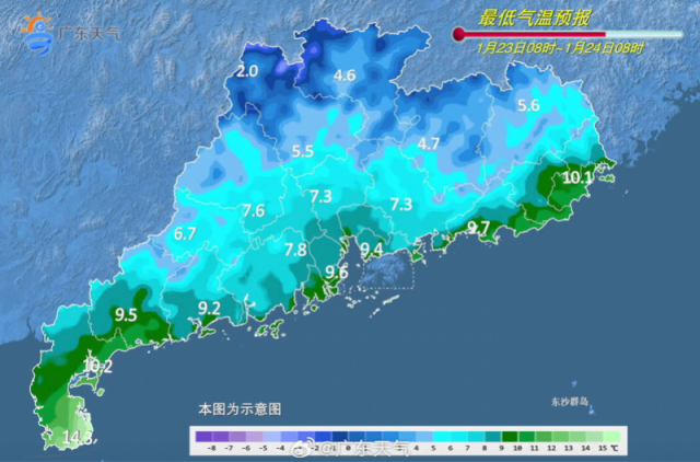 24日,珠江三角洲南部和粤东市县晴到多云,夜间转阴天,有分散性零星小雨,其余市县晴到多云。大部市县早晚有轻雾,局部地区有雾。最低气温:粤北偏北市县2-5℃,局部有霜冻,粤北偏南市县、珠江三角洲北部和东部市县、粤东的北部市县5-8℃,雷州半岛市县12-16℃,其余市县8-12℃。