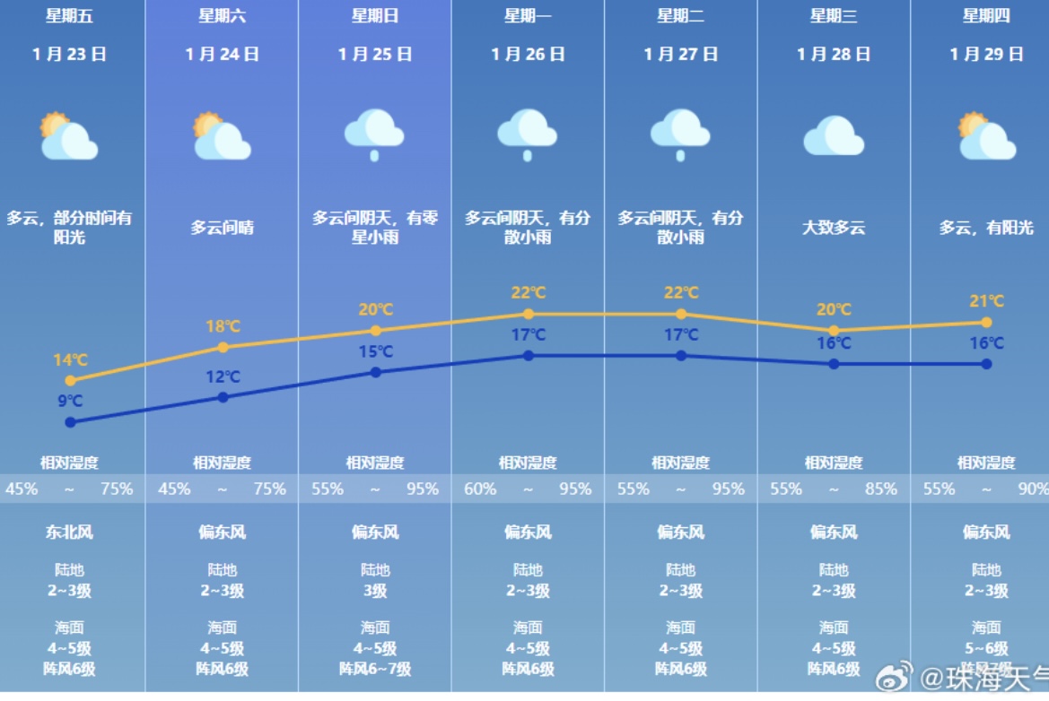 具体天气预报显示为,23日,云浮和珠江三角洲西部市县阴天间多云,其余市县阴天转多云间晴天。