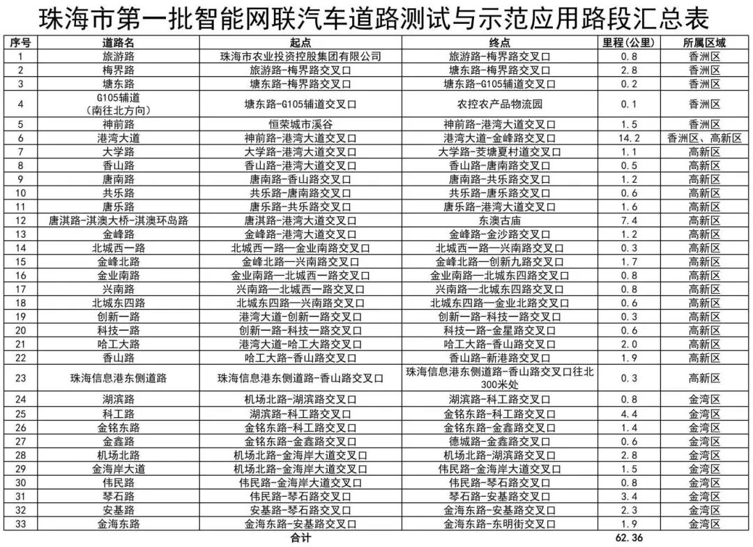 根据公示,为加快推动珠海市智能网联汽车技术发展及应用落地,结合新石器慧通(北京)科技有限公司、白犀牛智达(北京)科技有限公司、九识(苏州)智能科技有限公司等企业的申请情况,综合考量道路实际通行条件,珠海市拟开放香洲区旅游路、梅界路、塘东路、G105辅道(南往北方向)、神前路等路段,高新区港湾大道、大学路、香山路、唐南路、共乐路等路段,金湾区湖滨路、科工路、金铭东路、金鑫路、机场北路等路段,作为第一批智能网联汽车道路测试与示范应用路段(详见列表)。