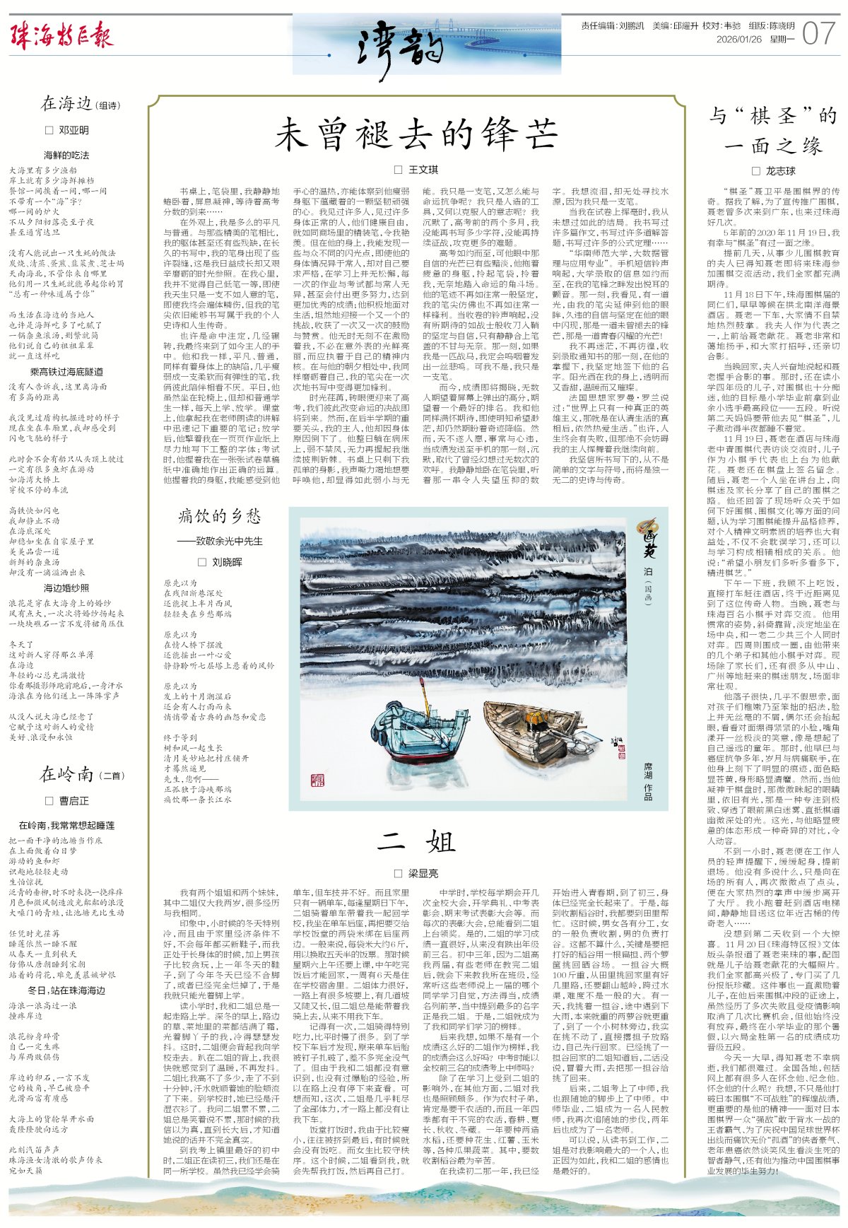 没想到第二天收到一个大惊喜。11月20日《珠海特区报》文体版头条报道了聂老来珠的事,配图就是儿子给聂老献花的大幅照片。我们全家都高兴极了,专门买了几份报纸珍藏。这件事也一直激励着儿子,在他后来围棋冲段的征途上,虽然经历了多次失败且受疫情影响取消了几次比赛机会,但他始终没有放弃,最终在小学毕业的那个暑假,以六局全胜第一名的成绩成功晋级五段。