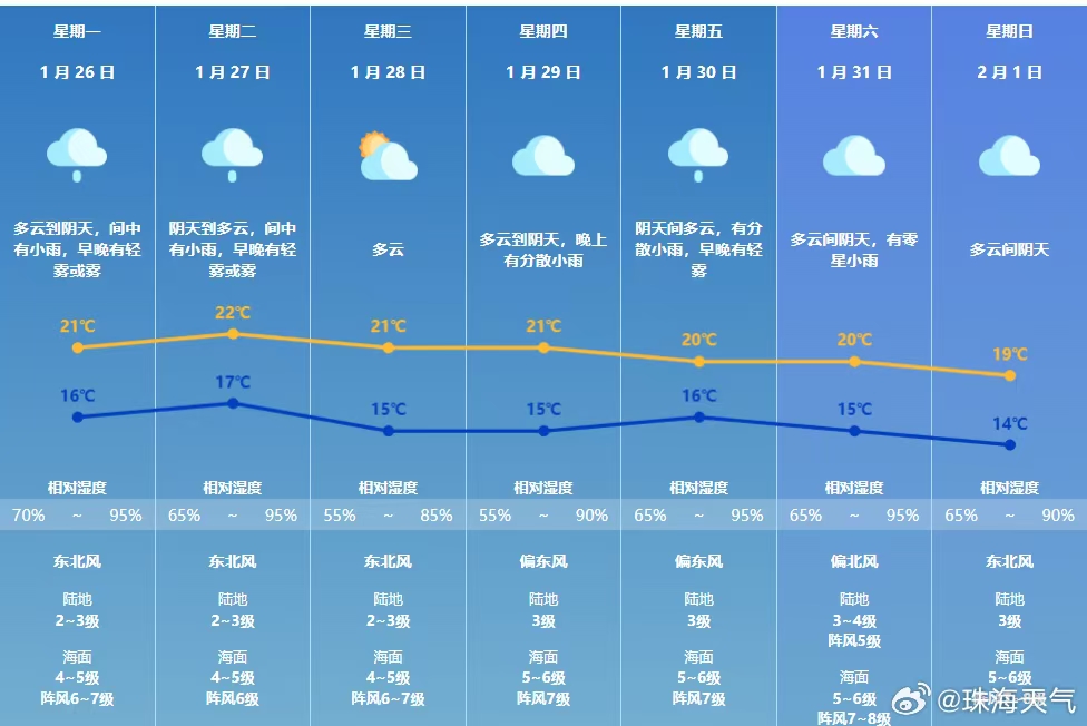 珠海七天天气预报:预计25日夜间至27日受东南气流影响,珠海市云量增多,湿度加大,间中有小雨,早晚有轻雾或雾;28-29日多云为主,气温略降。