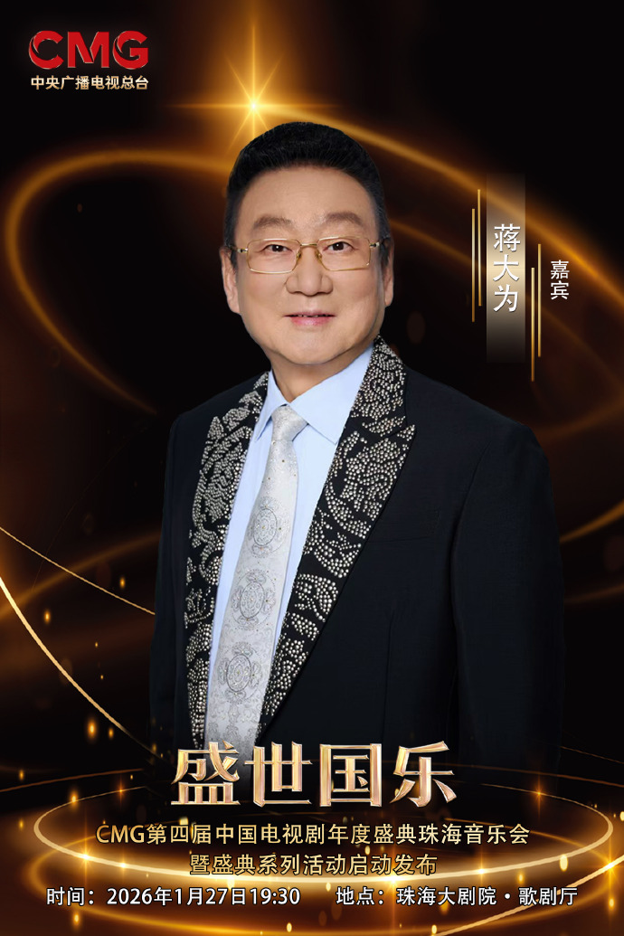 CMG第四届中国电视剧年度盛典珠海音乐会嘉宾阵容公布!他曾用《敢问路在何方》等经典歌曲,串联起几代人的荧屏记忆。1月27日晚,蒋大为将亮相《盛世国乐——CMG第四届中国电视剧年度盛典珠海音乐会暨盛典系列活动启动发布》,让我们以乐为舟,徜徉光影长河!