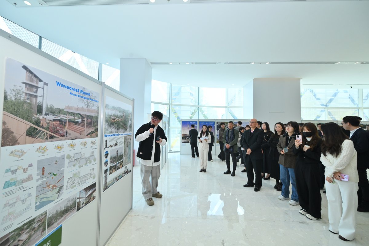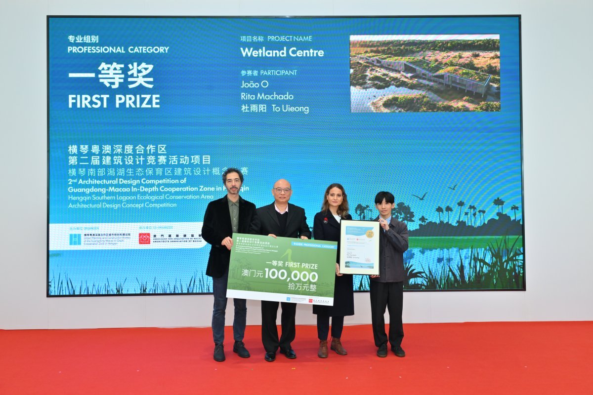 活动现场,比赛获奖团队获颁证书。其中,专业组别的三名一等奖得主分别为:Bruno Manuel Escada Pinheiro Malés,作品“椋鸟群飞”;马智晖,作品“栖循之径”;João O、Rita Machado及杜雨阳团队,作品“Wetland Centre”。两个获得优异奖的得主则为:唐道裕,作品“静观之间”;李子恩、周王瑜及许嘉莹团队,作品“双源共生”。学生组别一等奖得主为:张天译、宋彦星及武小斐团队,作品“逐浪丘–鹭鸟生态研究中心”。两个获得优异奖的得主为:朱广森、宋海娜及贾孟炎团队,作品“‘风浪栖羽’生态综合体”;沈凌睿、李华洁及帅涵宇团队,作品“藏形显意-横琴潟湖护飞与科研教育中心”。