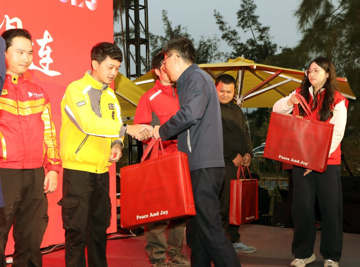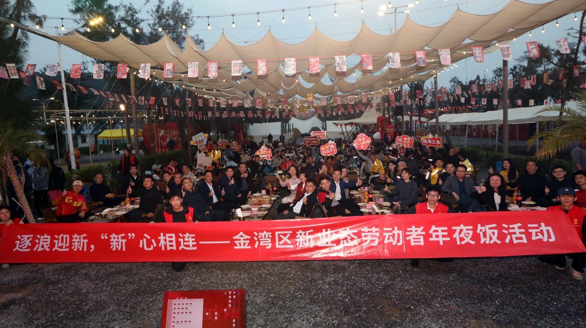 1月30日晚,珠海金湾金沙滩景区内灯火温馨、笑语阵阵,一场名为“逐浪迎新,‘新’心相连”的年夜团圆活动在此举行。200余名来自快递物流、外卖送餐、网约车及货车运输等行业的新业态劳动者携亲友欢聚一堂,共享暖意融融的年夜饭,喜迎新春。