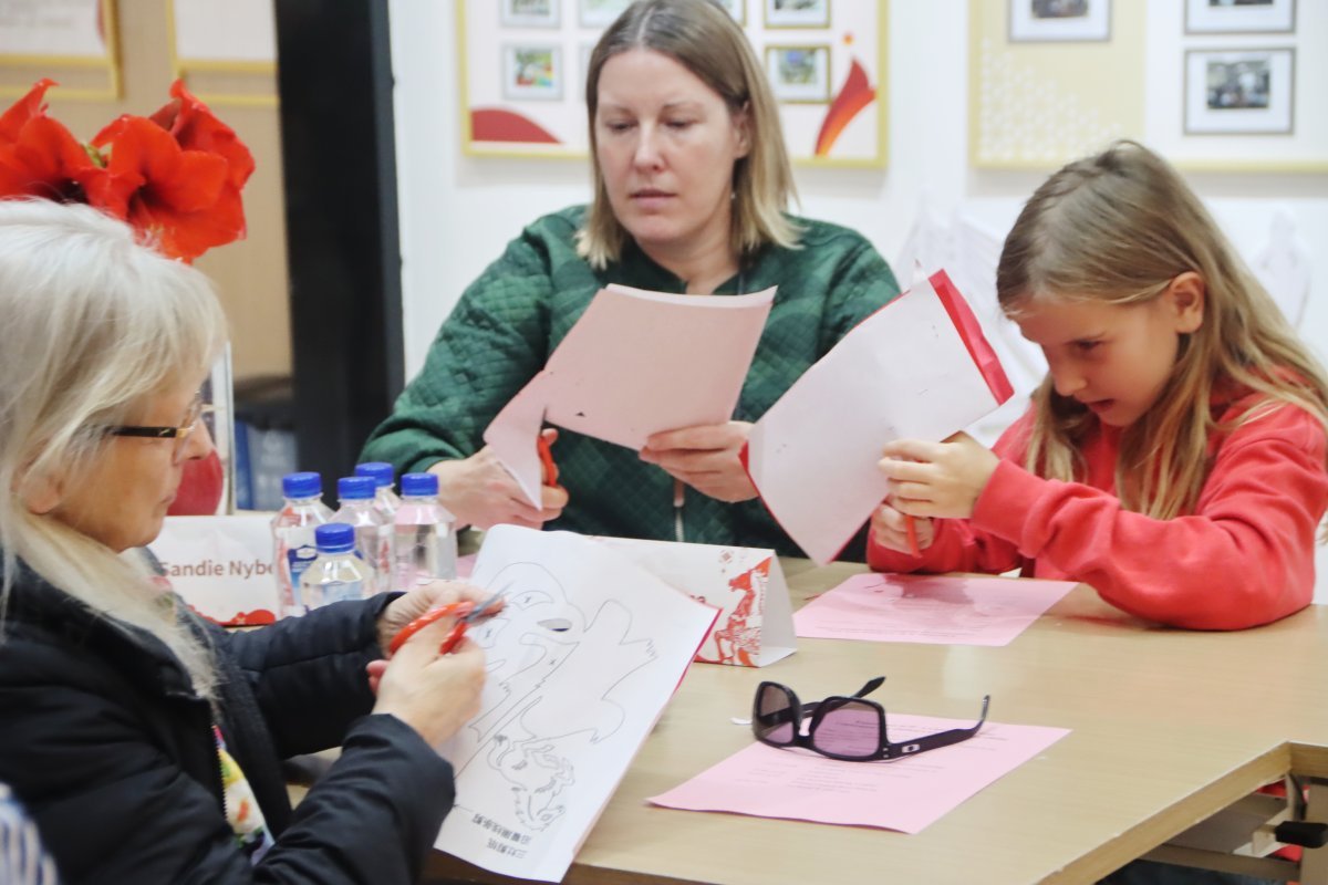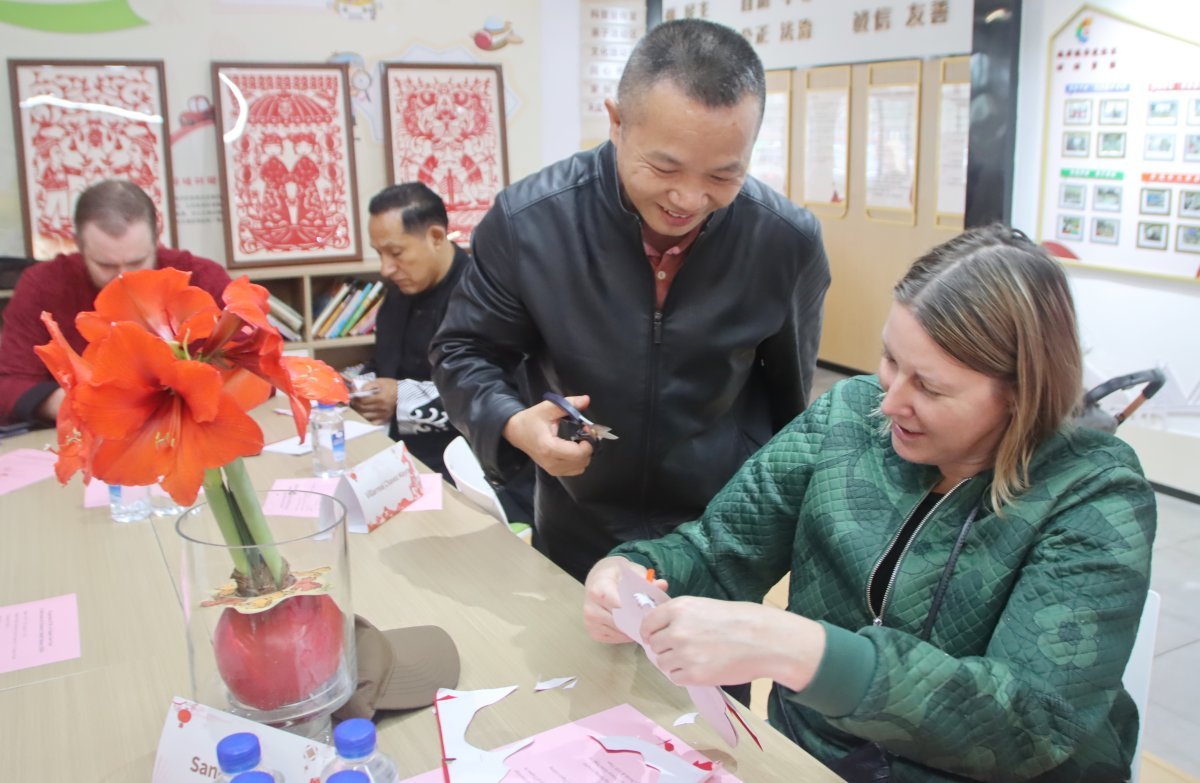在老师的指导和志愿者的协助下,外国友人们专注地进行创作,指尖翻飞间,一张张普通的红纸逐渐变成寓意吉祥的窗花、灵动传神的马影等剪纸作品。大家互相交流技巧、分享成果,将对新春的美好祈愿凝固在方寸剪纸之中。