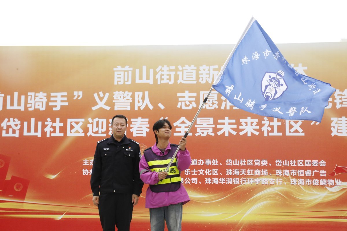 1月31日,前山街道新就业群体“前山骑手”义警队与消防救援先锋队在珠海对白剧场小广场同步成立,平日里穿梭街巷的外卖骑手们正式接过队旗、佩戴袖章,肩负起平安建设“流动哨”与应急救援“先锋兵”的双重职责,为前山街道基层治理注入新就业群体与新志愿力量融合的“双新”动能。