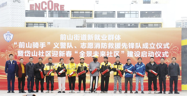 授旗仪式上,骑手代表接过“前山骑手”义警队队旗,消防救援先锋队的骑手们则佩戴上专属袖章,手中还配备了适配电动车初起火灾扑救的水基型灭火器。