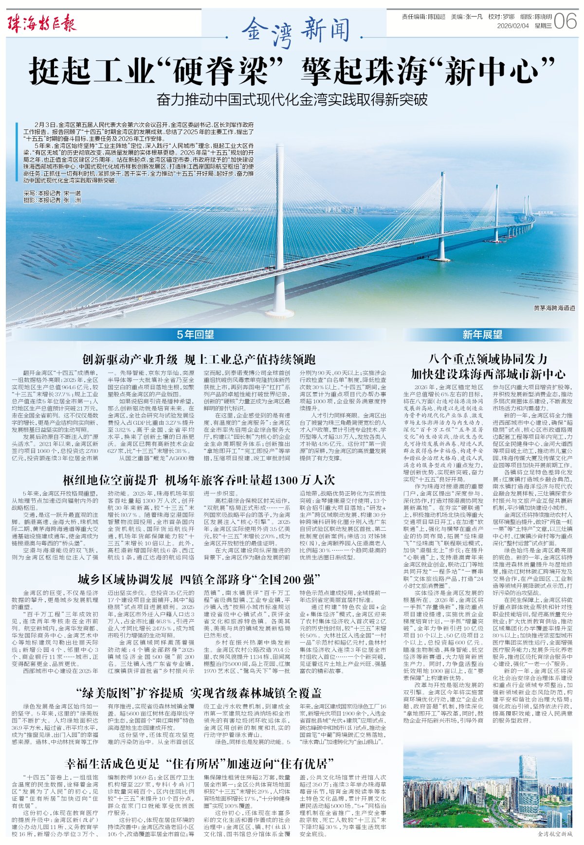 5年来,金湾区始终坚持“工业主阵地”定位,深入践行“人民城市”理念,挺起工业大区脊梁,“有区无城”的历史彻底改变,高质量发展的实体根基更稳。2026年是“十五五”规划的开局之年,也正值金湾区建区25周年。站在新起点,金湾区锚定市委、市政府赋予的“加快建设珠海西部城市新中心、中国式现代化城市样板创新发展区,打造珠江西岸国际航空枢纽”的使命任务,正抓住一切有利时机,紧抓快干、苦干实干,全力推动“十五五”开好局、起好步,奋力推动中国式现代化金湾实践取得新突破。