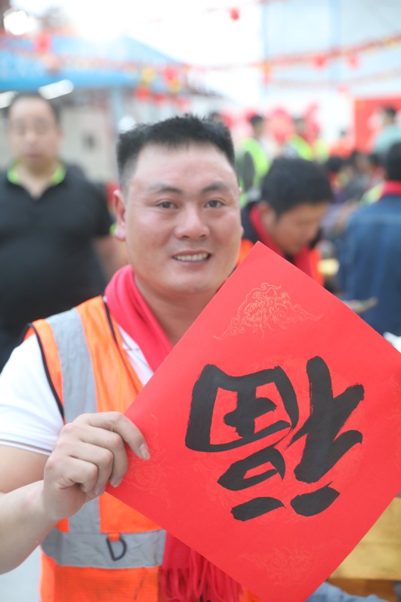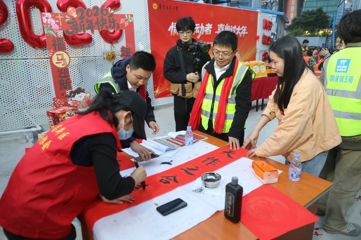 当天傍晚,建设工地褪去往日的喧嚣,被红灯笼、中国结和彩旗装点得暖意融融,处处洋溢着喜庆的氛围,书法老师挥毫泼墨,笔走龙蛇,一副副寓意吉祥的春联跃然纸上,工友们手持春联,脸上洋溢着幸福的笑容。新年主题打卡区里,大家纷纷举起红灯笼,定格下一个个温馨美好的瞬间,记录这份别样的新春喜悦。